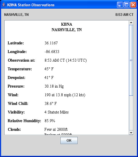 When selected, displays the latest surface observations from selected stations. The surface observation displays seven pieces of information:1. Wind Barb and Cloud Cover